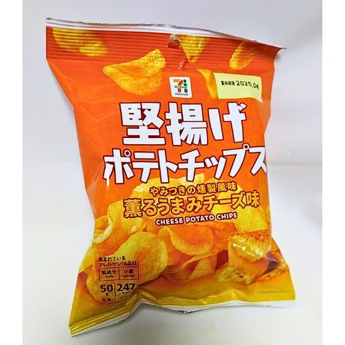 セブンイレブンの「堅あげポテトチップス やみつきの燻製風味 薫るうまみチーズ味」の感想レビュー。価格:税込み127円