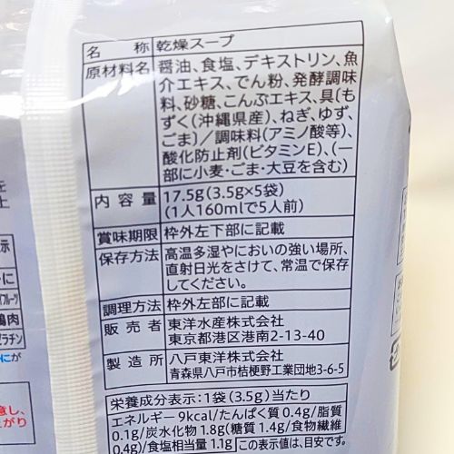 柚子の風味が好きりさっぱりとさせてくれます。 もずくと柚子のほかにはネギと胡麻が入っています。 シンプルなお吸い物。 だけどもずくのちゅるっとしてコリっとした食感も相まってクセになるうまさ。 うま~~~。 もずくスープは昔から大好きで セブンイレブンの物も試してみました。 安定の味でした。 マルちゃんでおなじみ東洋水産が製造しています。 間違いない味ですヨ。