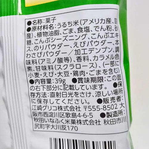 江崎グリコの「コメッコ」のりわさび味は、お米を主原料としており、アメリカ産と国産のうるち米を使用しています。